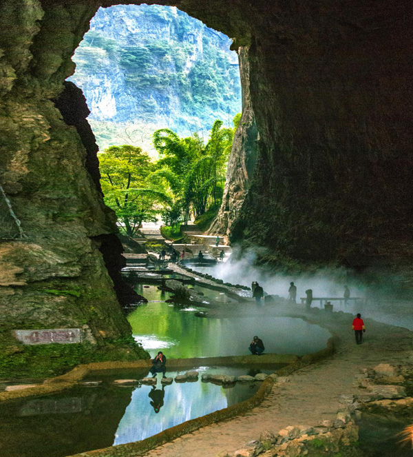 县城北的“大酉洞”景观(当地人称桃花源为大酉洞),是东晋大诗人陶渊明游记散文《桃花源记》的原型地。我心中藏着《桃花源记》,于是在身临其境之后,用《桃花源记》所记载的内容,处处对照现实中的桃花源。让我惊叹的是,这里的确印证了历史文献中关于桃花源的记载:“与渊明所记桃花源者,毫厘不爽。”沿着小溪进洞,“复行数十步”,当年酉阳直隶州知州罗升棓手书的“太古藏书”四个大字刻在崖壁上,向世人昭示着2000多年前咸阳书生“避秦时乱”的藏书之处。