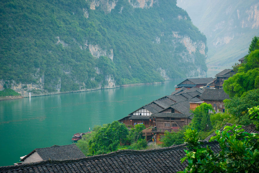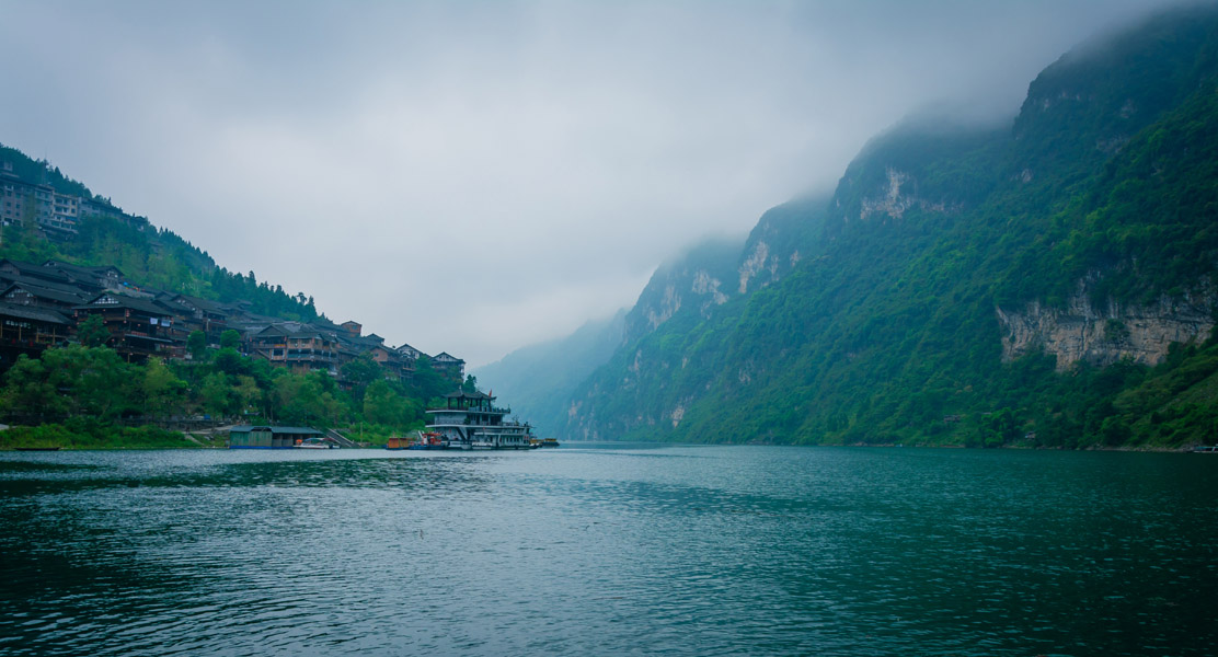 在龚滩古镇码头上船,逆江而上去领略极富盛名的乌江百里画廊绮丽景观,江上一回首,青山卷白云。船在水中行,人在画中游,让人更加难以忘怀,坐船尽兴而返。从江上眺望雨雾中沿江依山而建的龚滩古镇,突然有一种不可名状的感慨喷涌而出,古镇与乌江如同一对恋人相互依偎,在风雨飘渺中厮守千年,忠贞不渝。