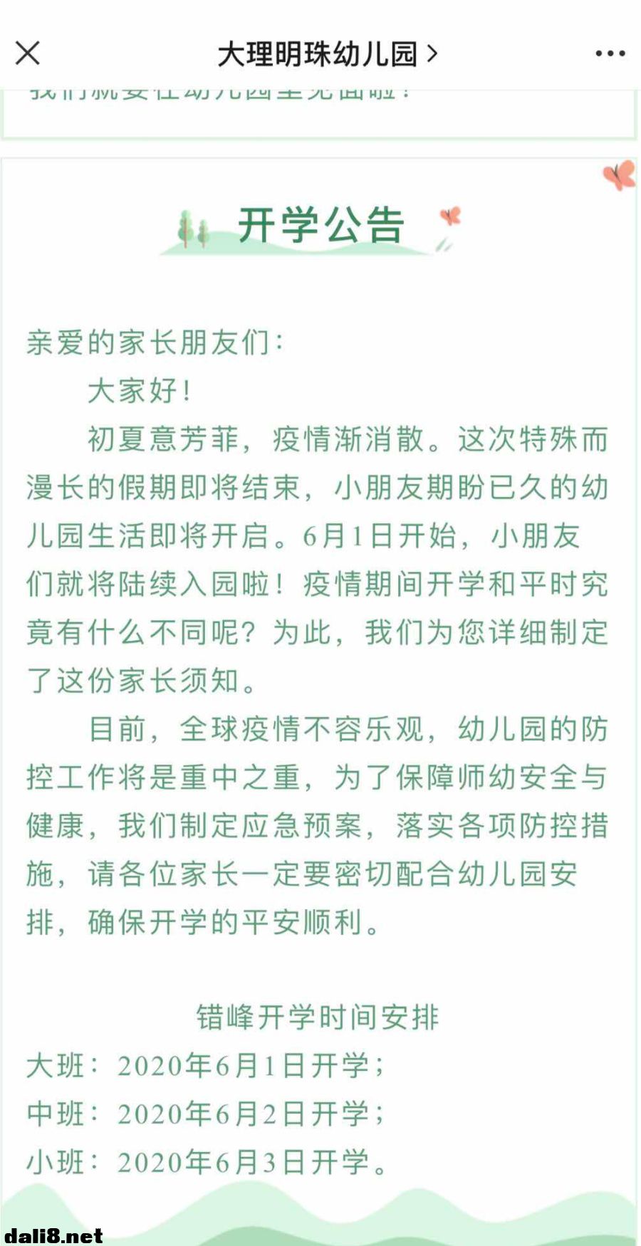 . s- a- F$ c J' q1 F据了解,云南省教育厅在5月18日发布了《关于幼儿园和特殊教育学校有序开学的通知》,通知里提到:“达到开学要求的幼儿园和特殊教育学校,5月25日起可以开学;达不到开学要求的,暂缓开学”大理州也转发并执行了省教育厅的通知文件。