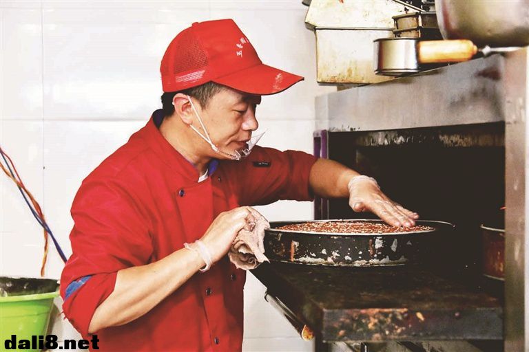 玉香园糕点店位于巍山古城文献街,窄窄的店门口飘荡着清香。操作间里,现年35岁的董绍林和父亲董正祥,及几位工人正在精心制作月饼。只见他们将备好的面粉放在桌上,中间扒开一个坑,放入适量的鸡蛋、香油、白糖等食材后搅拌均匀,不一会儿便和出了金黄的皮面。随后再将烤好的馅料剁碎,加入红糖、豆沙、玫瑰糖等配料,一盆香甜可口的馅料便拌好了。董绍林和工人们分工合作,包馅,压制……