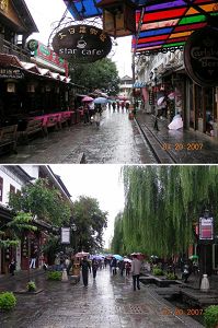 4 z# d* L* _+ ?8 o. k1 }( d昨天在古城内,当地人的善良、谦和给我们留下了极好的印象,可林子大了什么鸟都有,今天竟遇到这种败类。车子沿原路回到公路上,为避免再生枝节,要求司机送我们到古城南门下车。可能是想找点心理平衡吧,这家伙把车开到了玉洱路上并再次撒谎说这就是南门,真是本性难改!不过这正是我们想来的地方,也不再计较,到了兰陵阁酒店前直接下车。这家伙两次施骗均无功而返,接过给他的25元钱悻悻离开。“虎口脱险”之后松了口气,雨似乎一直随着我们的心情而变化,刚才在码头时大雨滂沱,现在居然一下子停了。此时方想起最初决定坐公交车的原因其实就是为了防止被出租车骗到,可惜时间一长竟把这么重要的环节忘掉了。和LP及Windy说起前因后果,自然免不了一番感慨。有道是临阵换帅是大忌,现在看来临行换线路也会出问题。