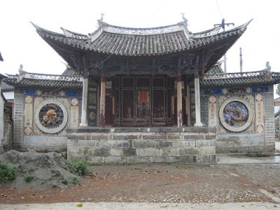 到古生村下车,这里是个小小的广场。广场一侧有座牌匾为“水晶宫”的白族式门楼,门楼的石雕、砖雕鲜艳美观。进门一看,原来是古生村的本主庙,供奉的是托塔天王。白族的村庄都有自己的本主庙,所供养的偶像不一,既有神、佛和传说中的虚构人物,也有确有记载的古代名人。一到重要节日,大家便会聚集在本主庙前,展开盛大的祭祀活动。