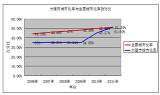 在城市化率的对比中,我们用大理市城市化而非大理州城市化率进行对比分析,在数据的采用上,我们采用大理年鉴中的非农业人口,这样的统计更加精确的表明大理市城市化率,数据统计和对比的图示如下:: x0 N* a3 K2 h k8 l