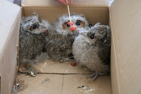 5月4日早, 大理弥渡县一位热心村民将3只小猫头鹰送到弥渡县森林公安局,称3日下午猫头鹰掉落在他家院子。